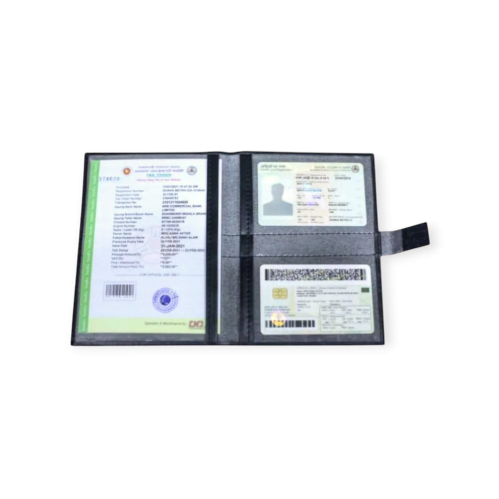 - Size 5.5 inches X 6 inches You can keep license, driving card, tax pair document of any vehicle including motorcycle The document will not be fried It is made of pu leather There is no possibility of document loss if it gets wet in rain 3 separate safe pockets